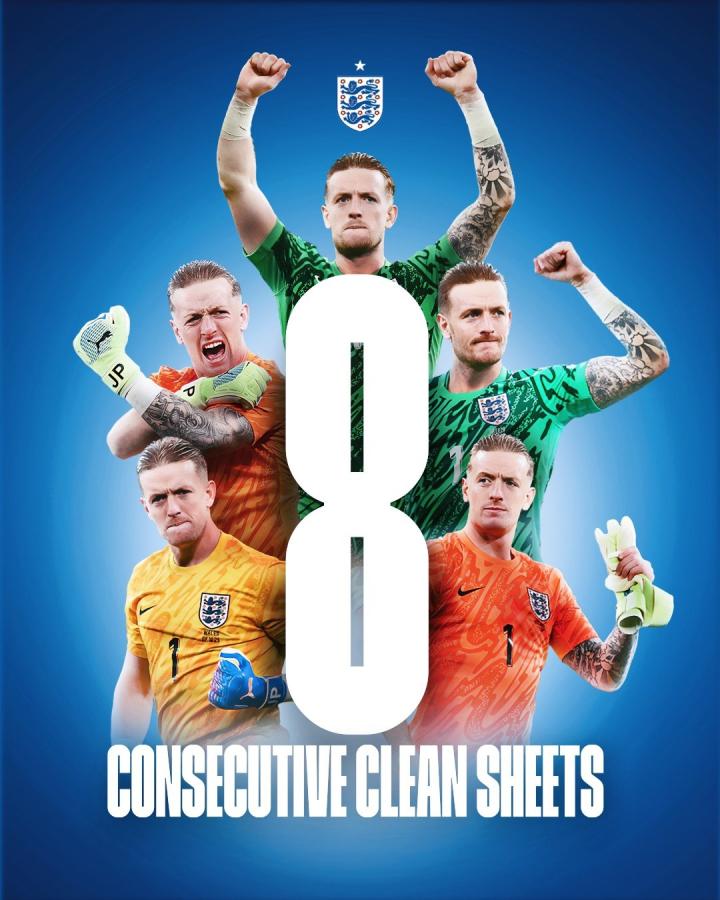 英格兰官方晒皮克福德海报:连续8场零封,三狮军团队史第一人